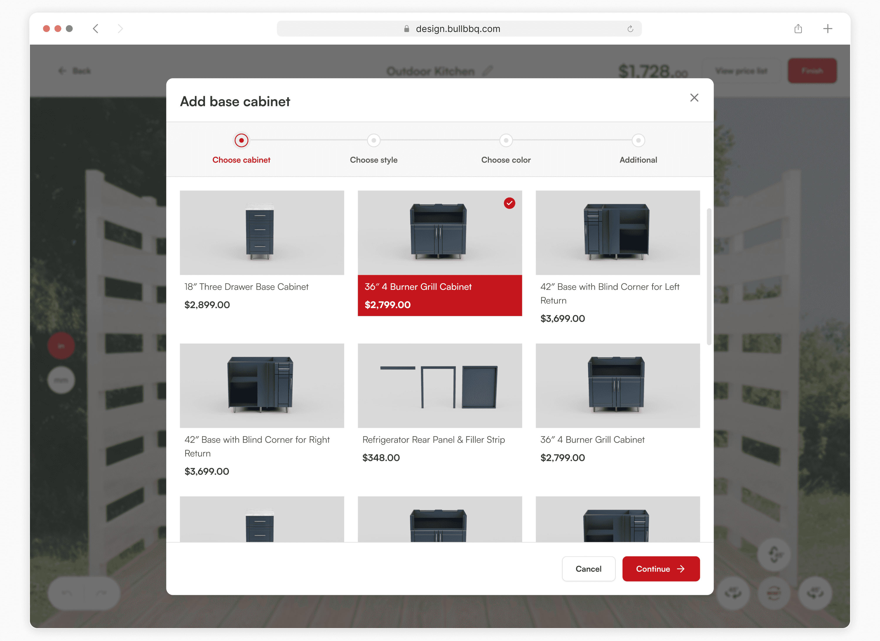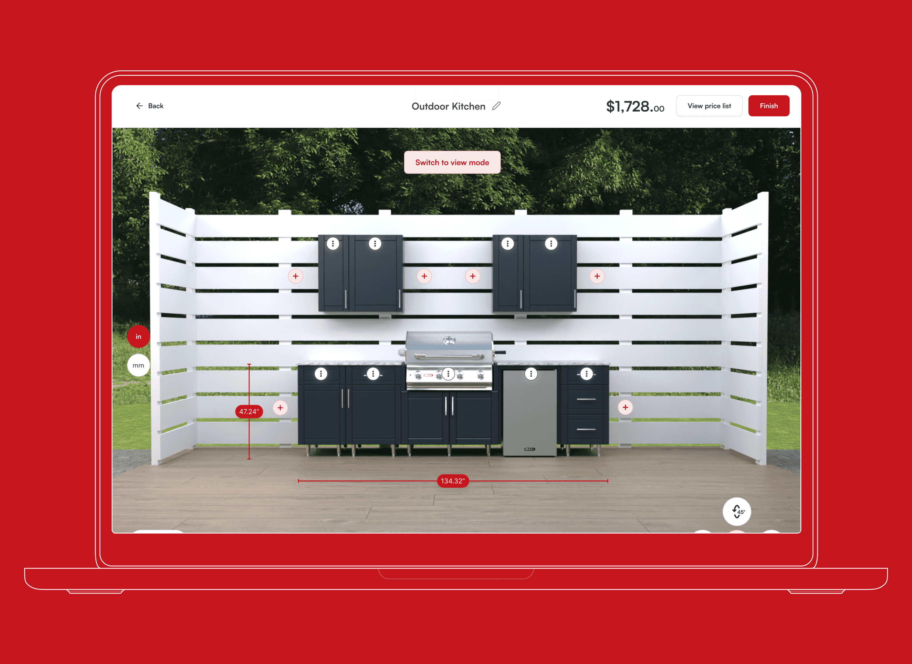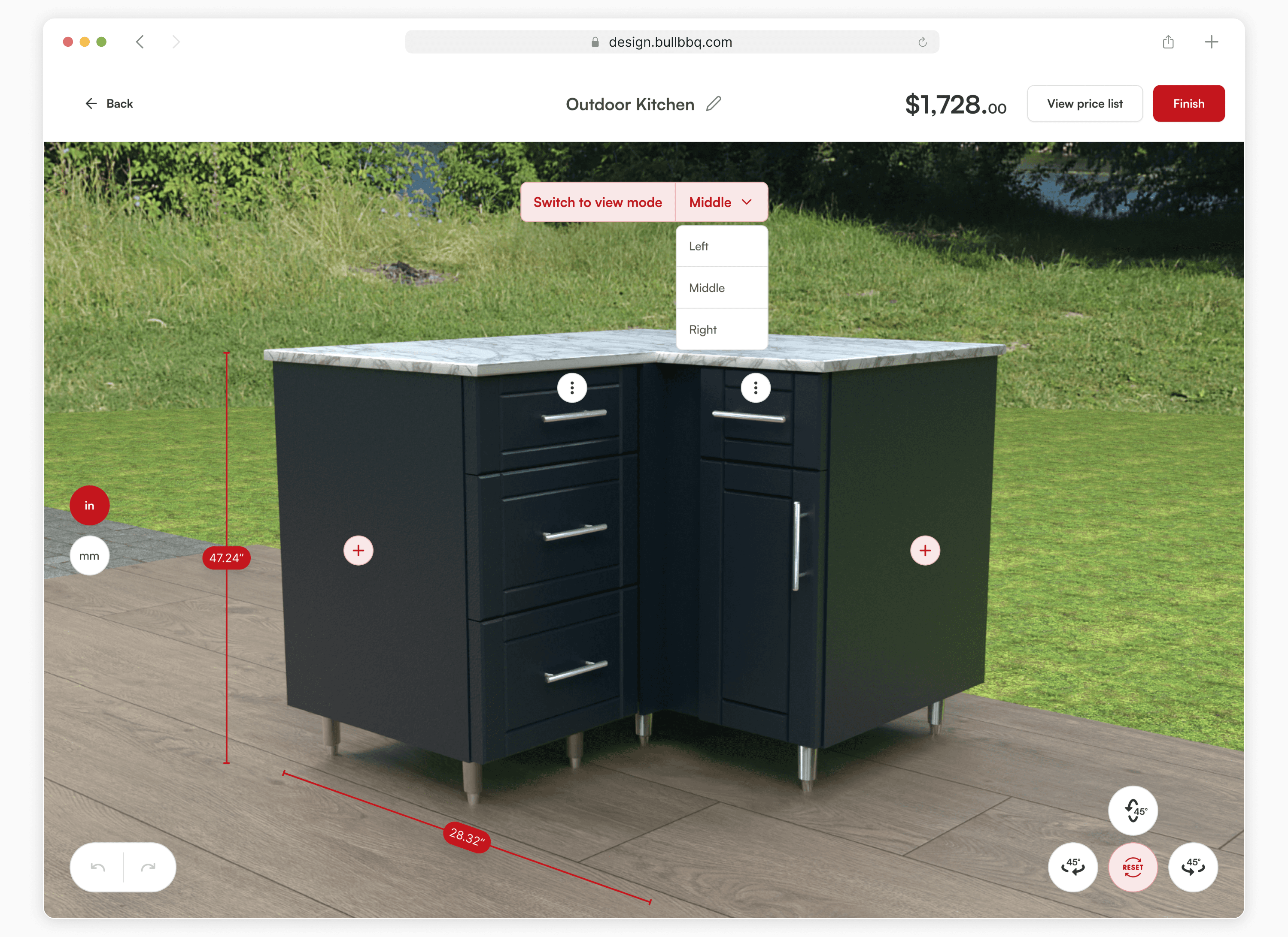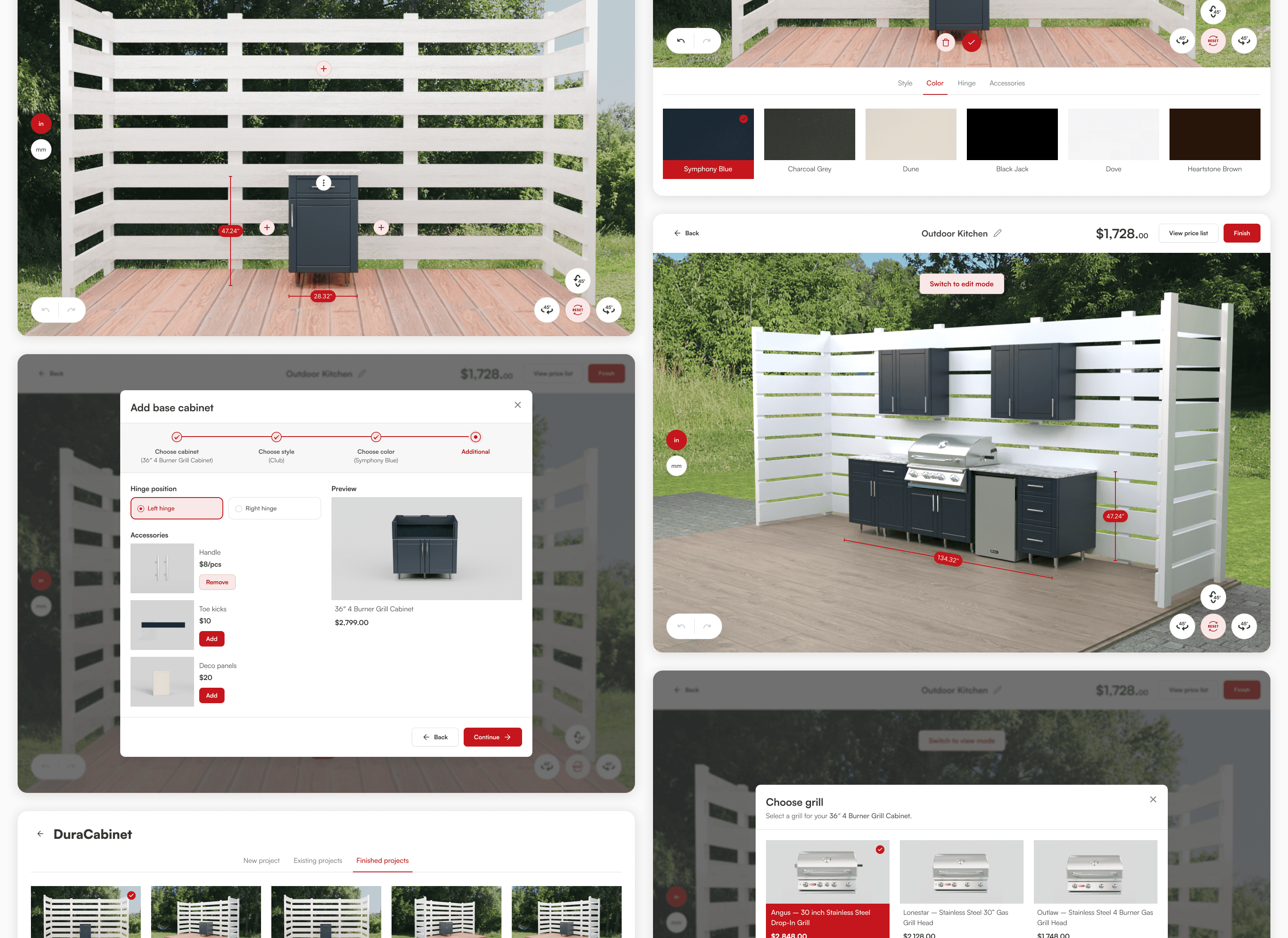 Bull Outdoor Products, a company with 25+ years of expertise in outdoor kitchens, wanted to create an interactive 3D configurator for their DuraBull product line. The goal was to let users build and preview their custom kitchen layout, including cabinets, grills, sinks, and more, with live measurement and pricing updates.