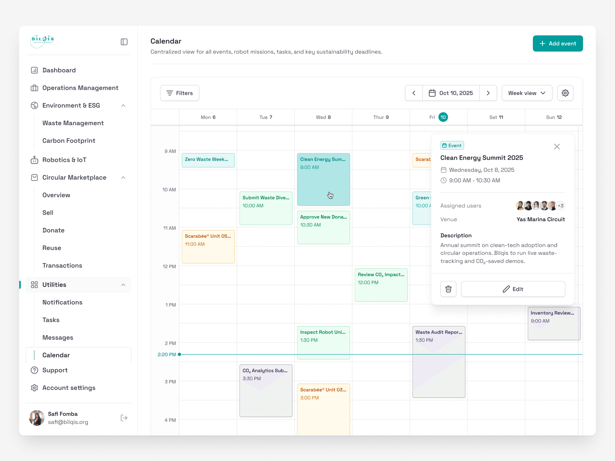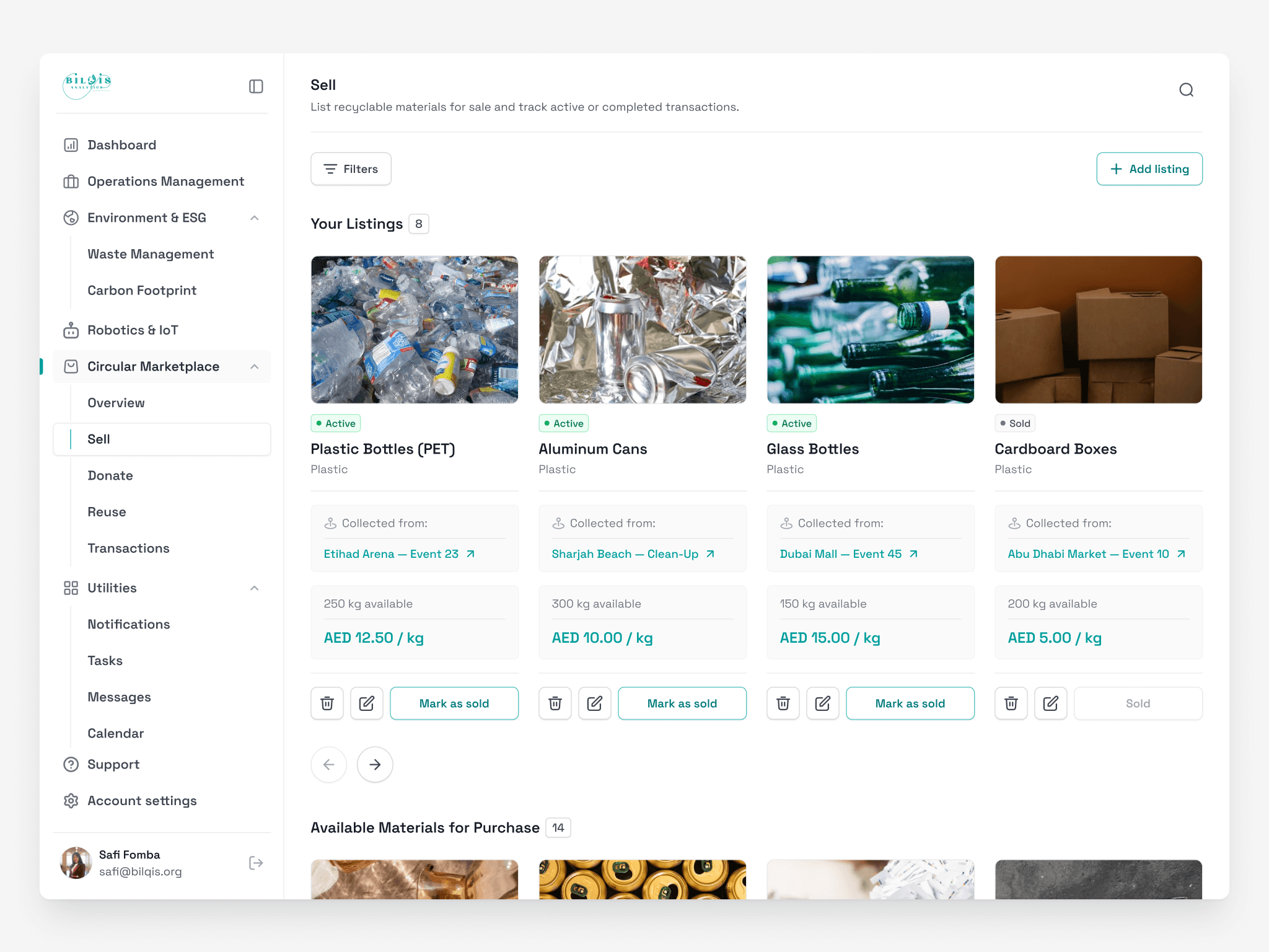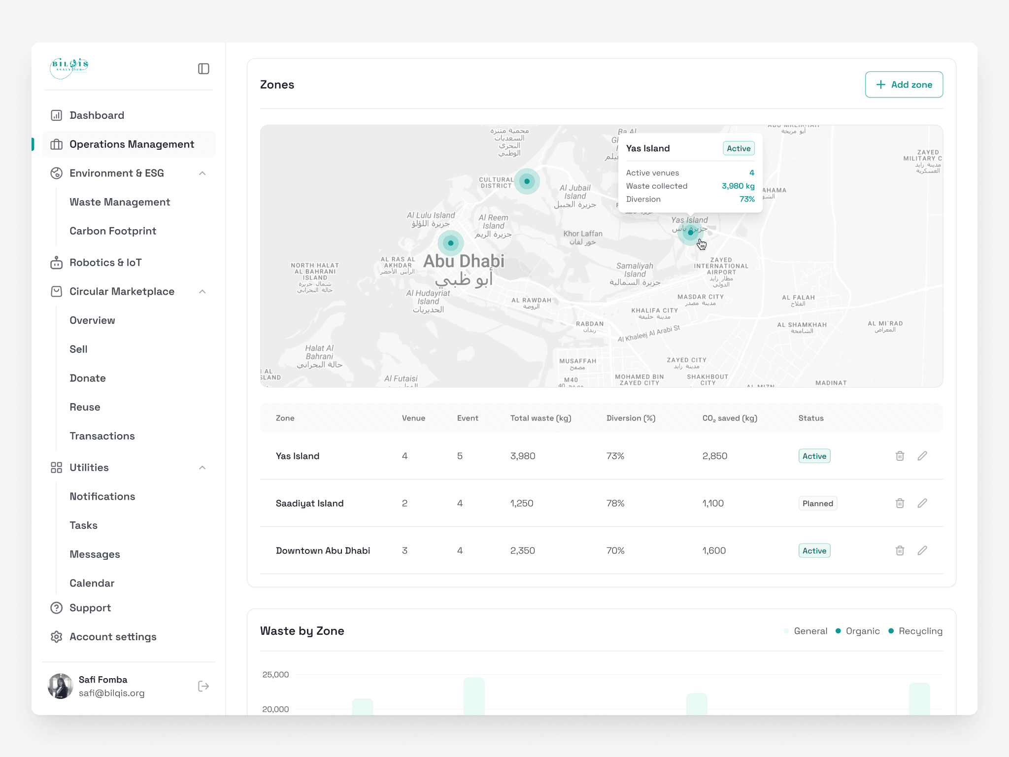 Bilqis Analytics is a cloud-based sustainability dashboard designed to track waste, CO₂, and diversion metrics across events, venues, and smart cities. It transforms waste data into actionable insights and supports circular operations through its built-in marketplace for recycling, reuse, and donations.