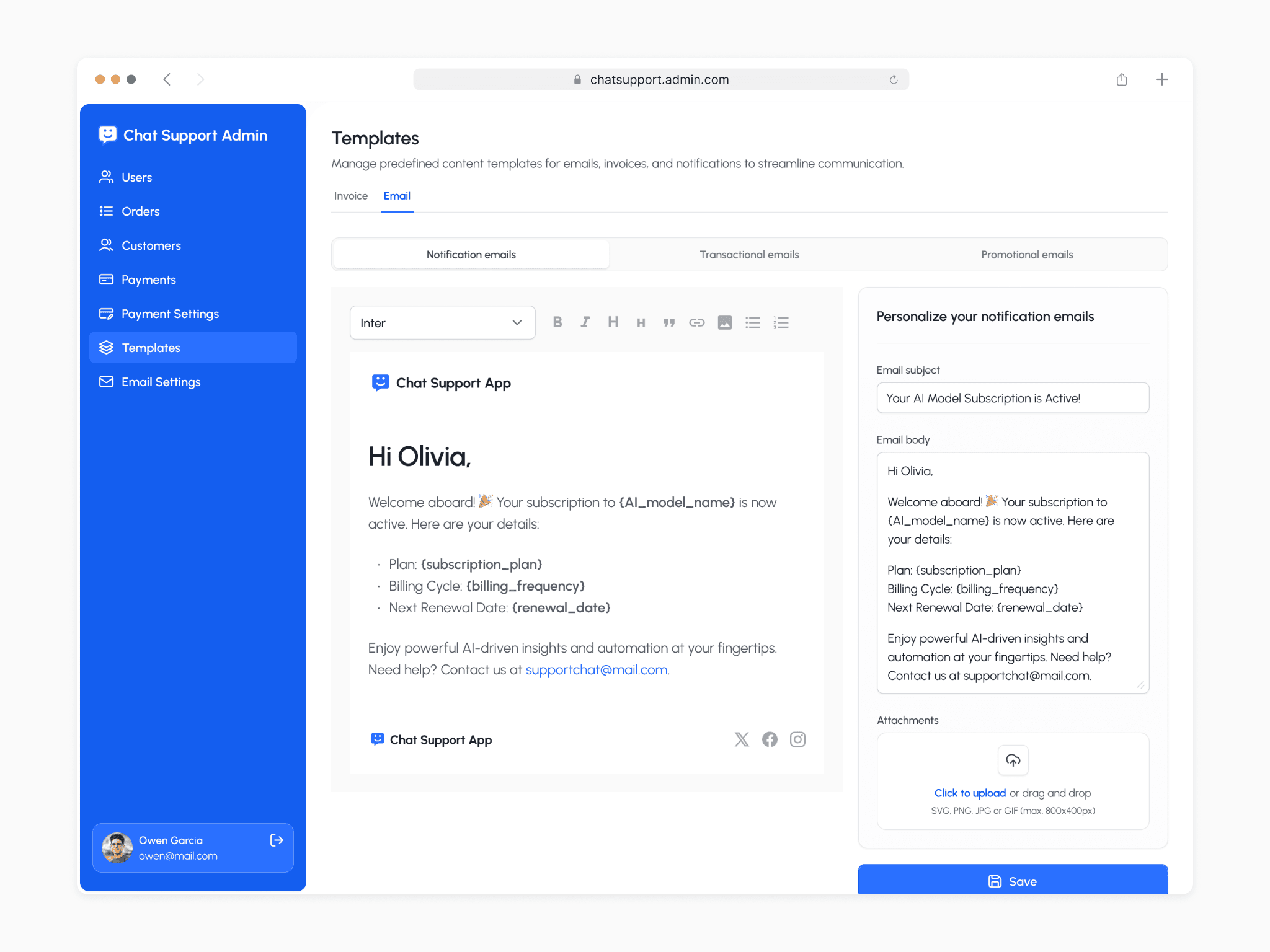 A full admin panel to manage customers, subscriptions, payments, analytics, and templates.
