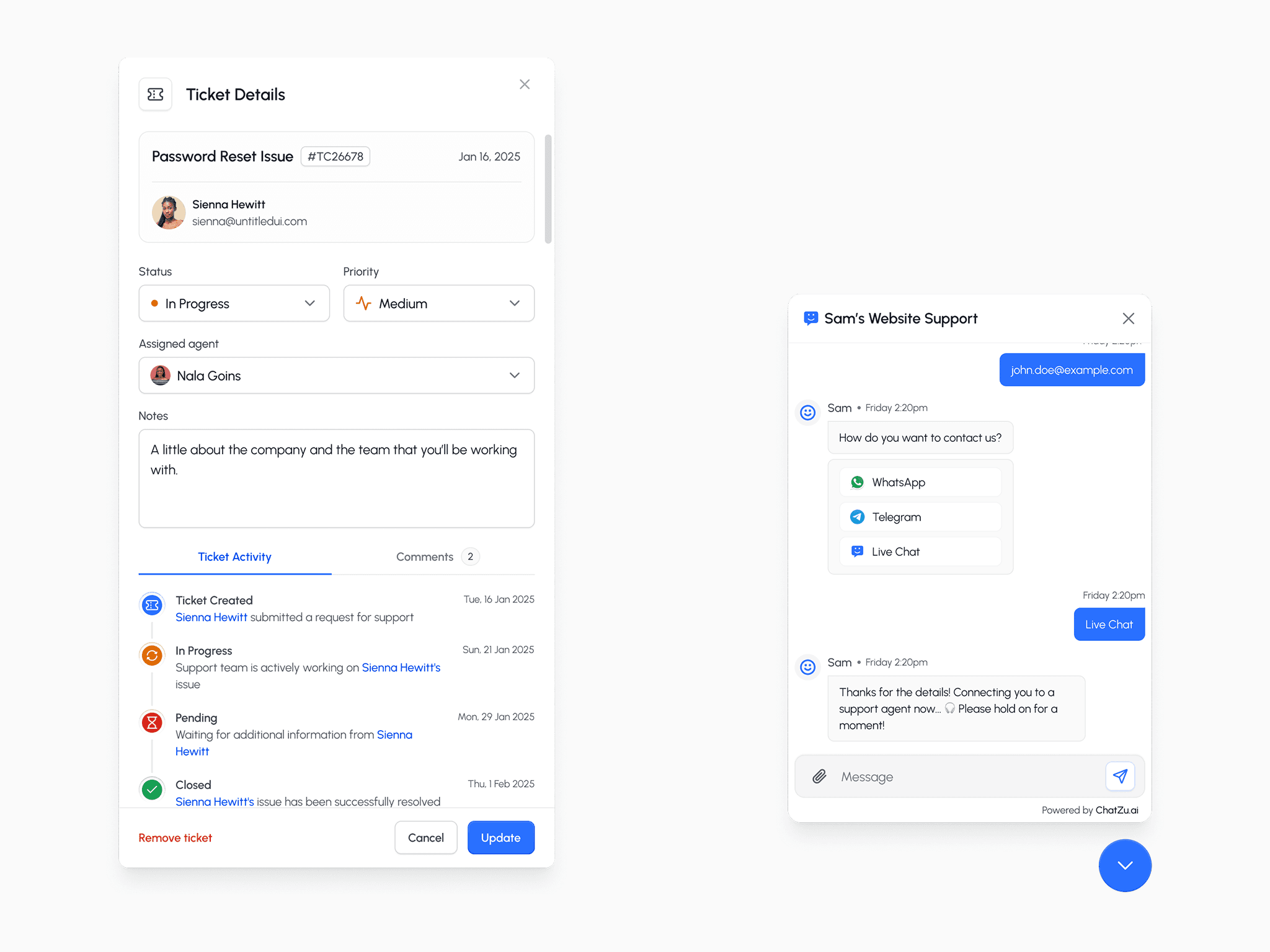 Frontend Widget – a lightweight support tool embedded in websites with chat, file upload, and AI response options.