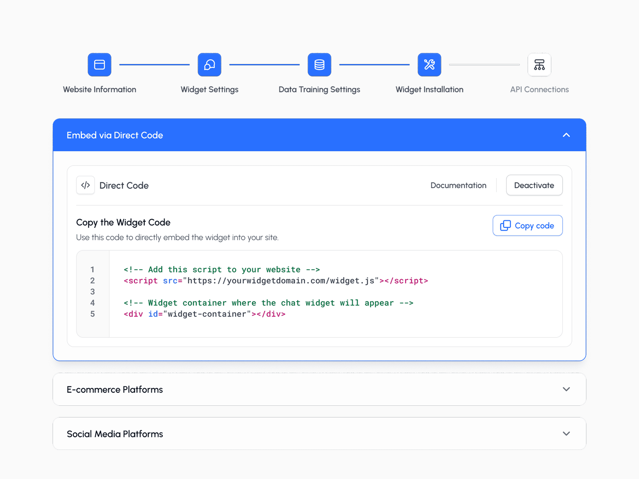 Making the widget lightweight yet powerful, supporting quick replies, emojis, file attachments, and AI-generated responses.