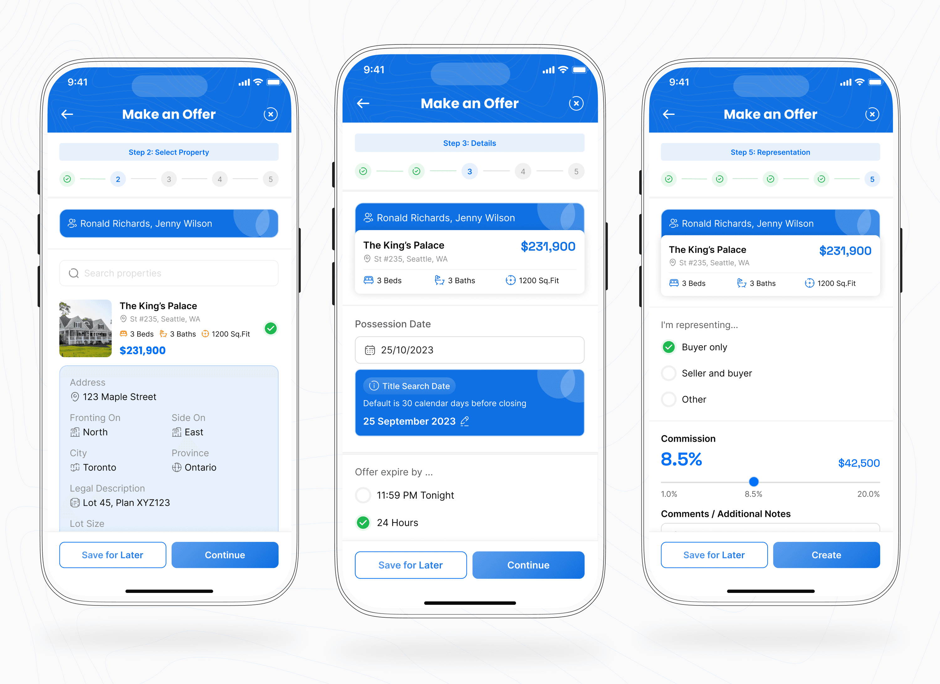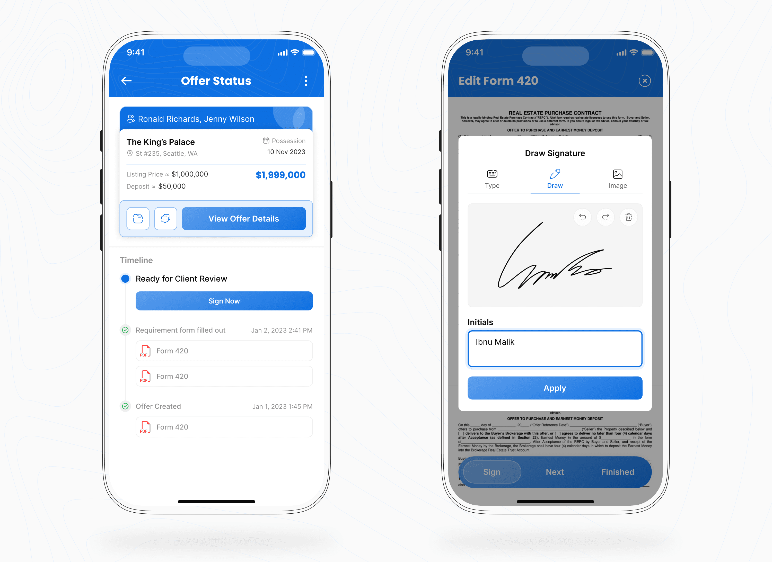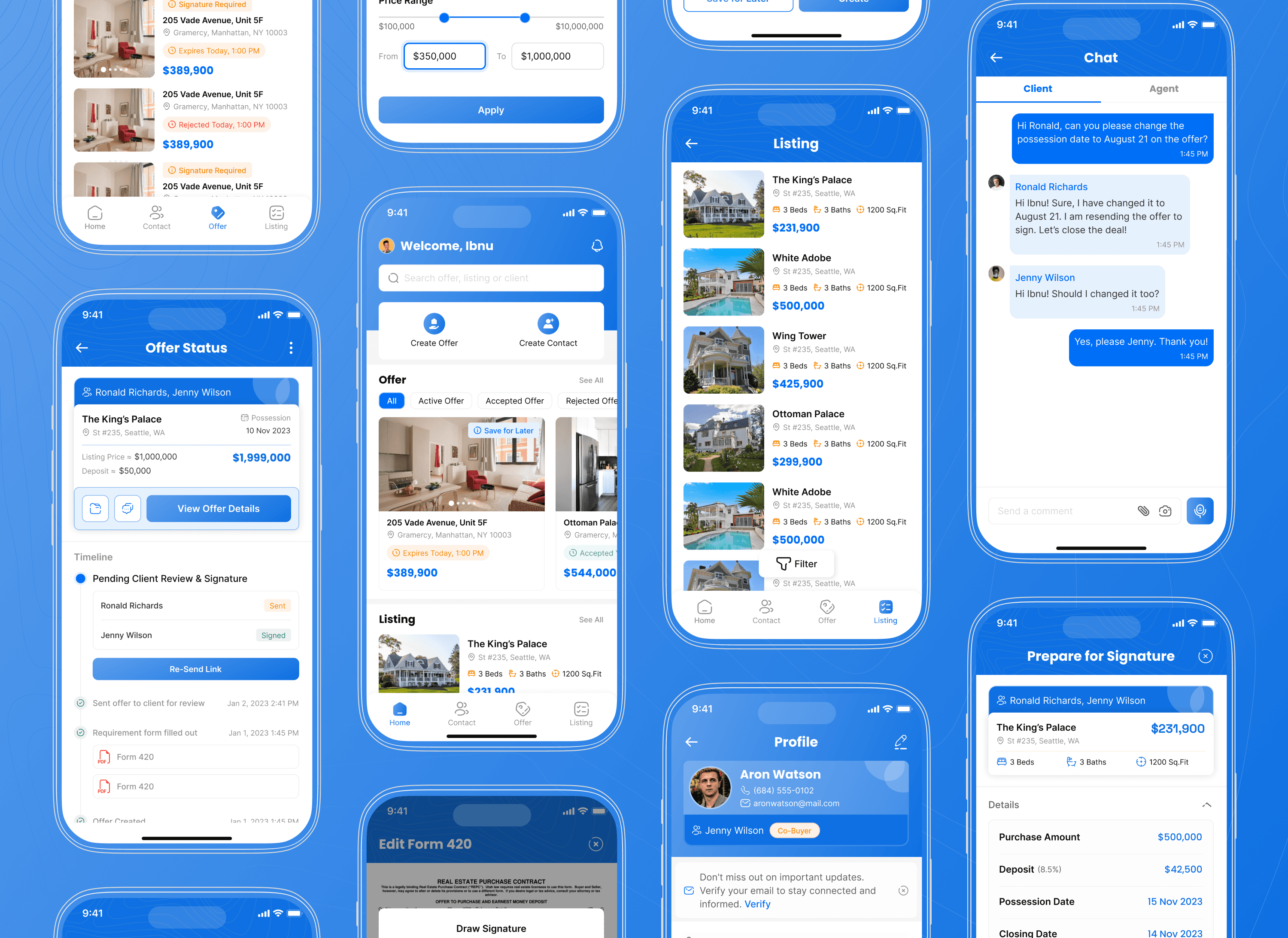 Delivered a modern, feature-rich mobile design for OfferNow that replicates the real-life real estate process while keeping the UI intuitive for both agents and clients.